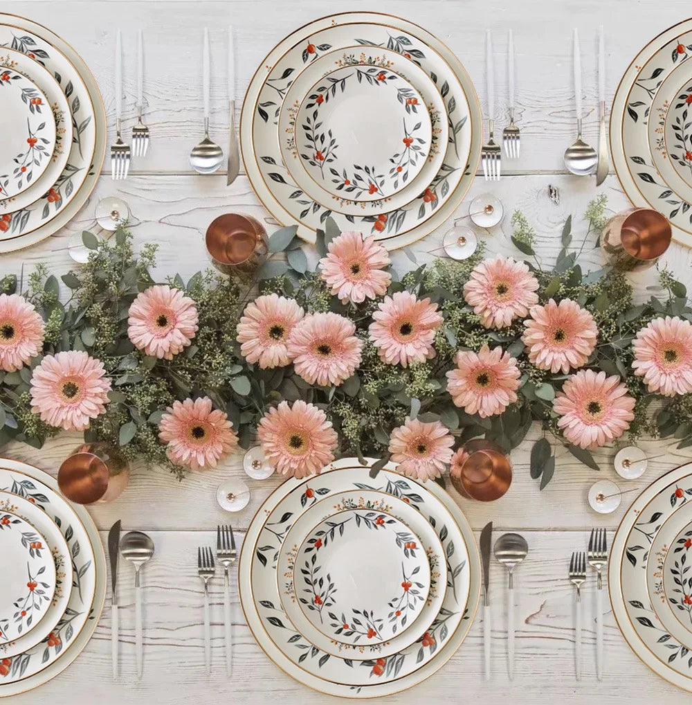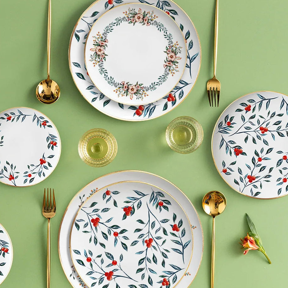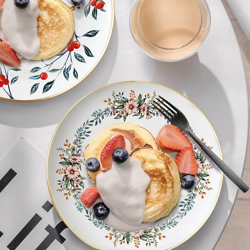 A beautifully balanced plate featuring a central floral wreath that frames the dish elegantly. Ideal for salads, desserts, sandwiches and lighter meals.