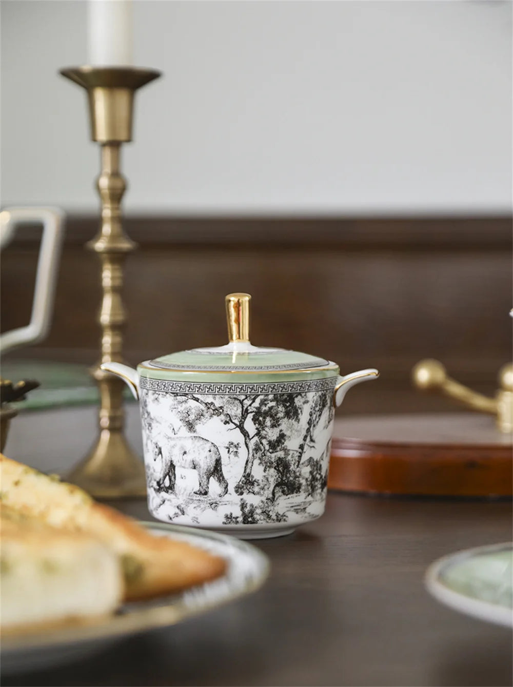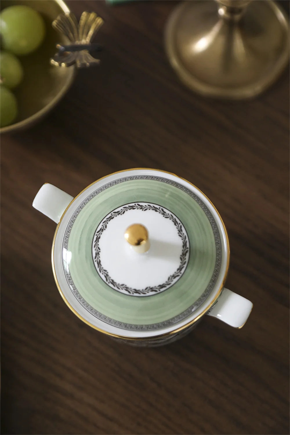 A beautifully decorated sugar jar with dual handles and a gold-finished lid.