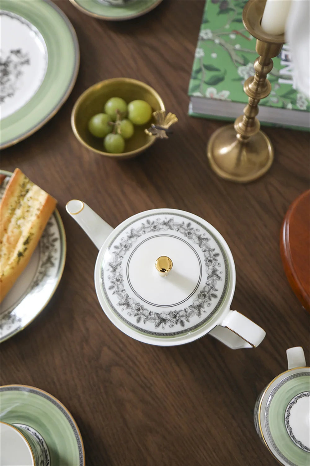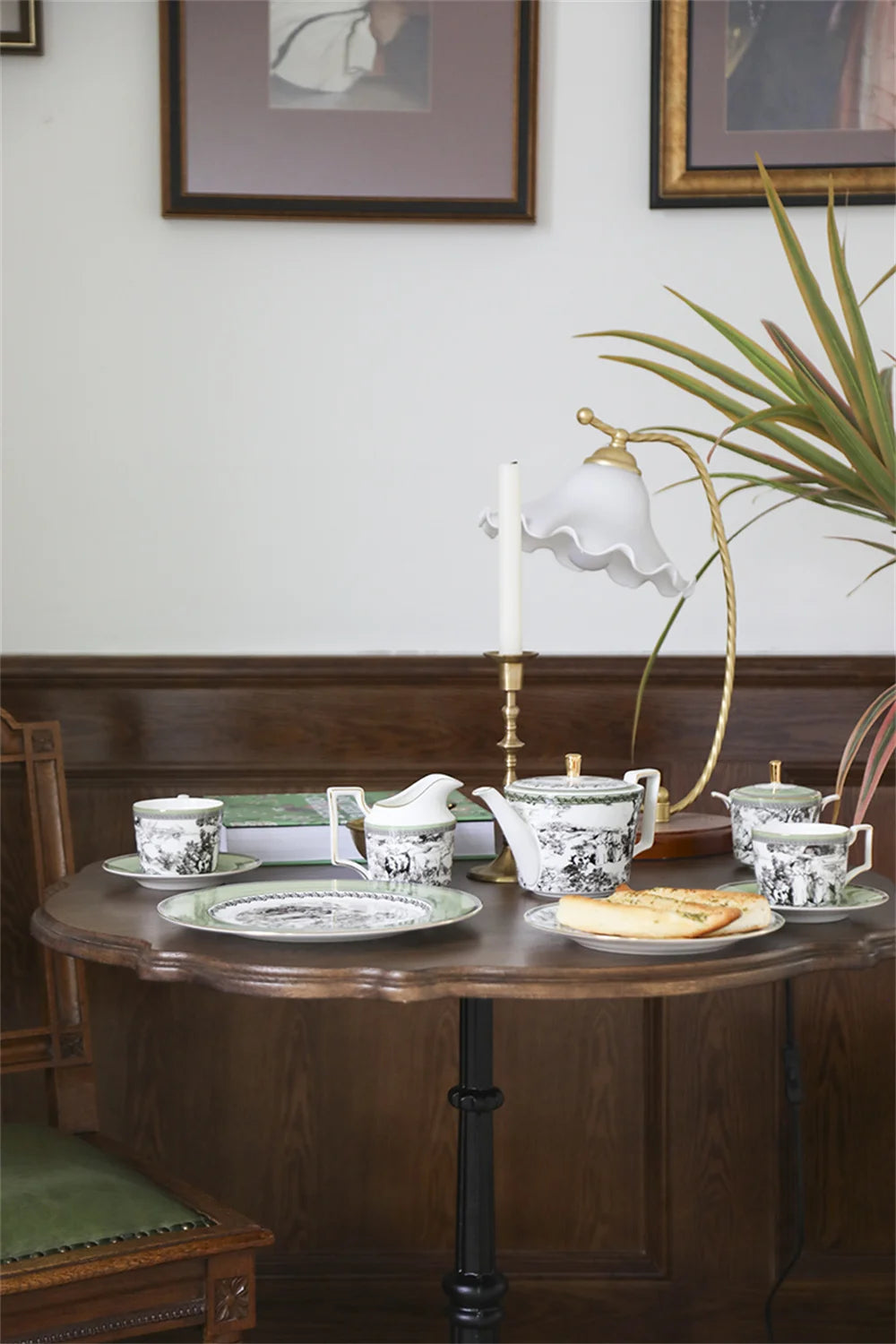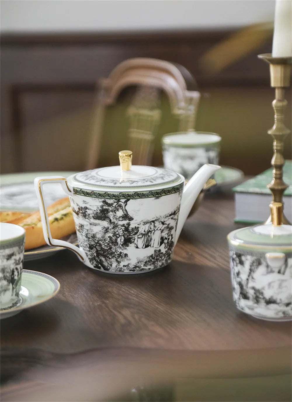 The saucer introduces a soft sage-green border with a toile center, creating a harmonious and balanced look.