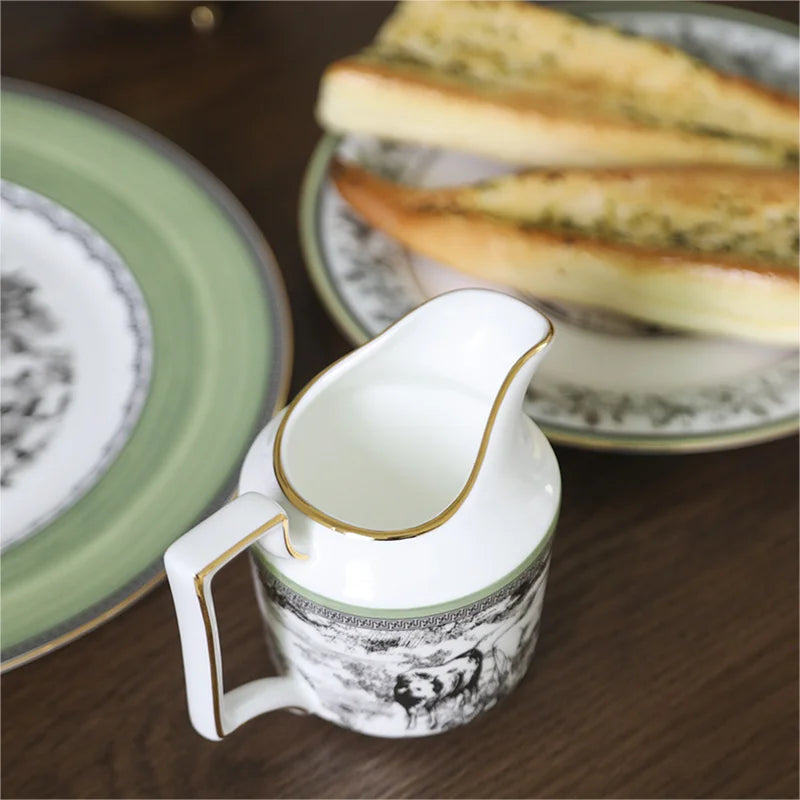 A refined milk jug featuring a curved pouring spout, gold-trimmed handle, and toile illustrations across the body.
